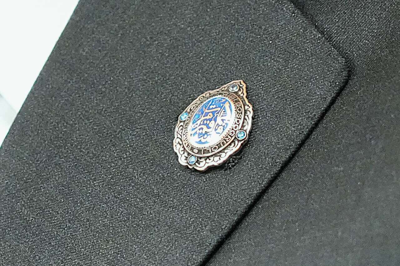 Rozet, oval ve desenli bir formda tasarlanmıştır. Uzerinde Hud Suresi 112. Ayet, günümüz alfabesi ile Türkçe olarak ve hat sanatı üslubunda işlenmiştir. Rozet yüzeyinde kullanılan yazılar, özel bir mine işçiliği ile renklendirilmiş; mine tonu, yüzükte kullanılan London Blue Topaz taşın rengiyle uyumlu olacak şekilde hazırlanmıştır.