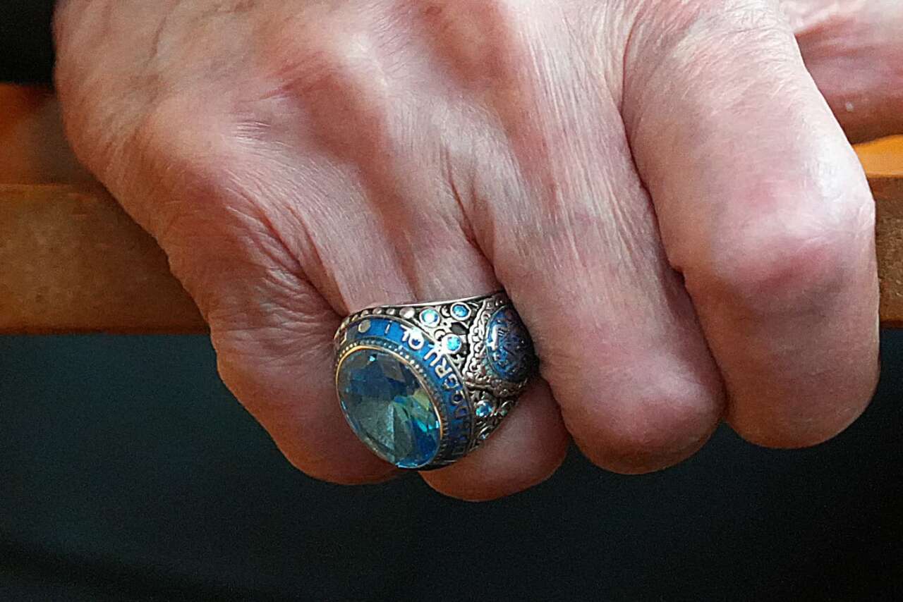 Yüzük tasarımında, London Blue Topaz olarak adlandırılan, topaz cinsi özel pırlanta kesim bir taş kullanılmıştır. London Blue Topaz; orta ila koyu renk doygunluğuna sahip, mavinin derin bir tonunu yansıtır. Sadakat mücevheri olarak bilinen topaz taşlarının bu özel tonu, güçlü ve anlam yüklü bir sembolizm taşır. Mavi topazın, bilgi ve bilgeliğin enerjisini yansıttığına inanılmaktadır. Taşın çevresinde; Hud Suresi, 112. Ayet'ten alınan "Emrolunduğun gibi dosdoğru ol" ifadesi, günümüz alfabesi ile Türkçe olarak yüzüğün üst kısmına dengeli bir kompozisyonla işlenmiştir. Ayet lafz -1, taşın merkezî konumunu vurgulayan dairesel bir hat oluşturarak tasarıma manevi bir derinlik kazandırır. Yüzüğün yan yüzeyleri, mıhlama teknigi kullanılarak London Blue Topaz taşlar ile süslenmiştir. Yan kısımlarda, aynı ayet-i kerime, hat sanatı estetigi gözetilerek rölyef (kabartma) teknigi ile uygulanmıştır. Böylece yüzüğün her cephesinde, anlam ve estetik sürekliliği sağlanmıştır.